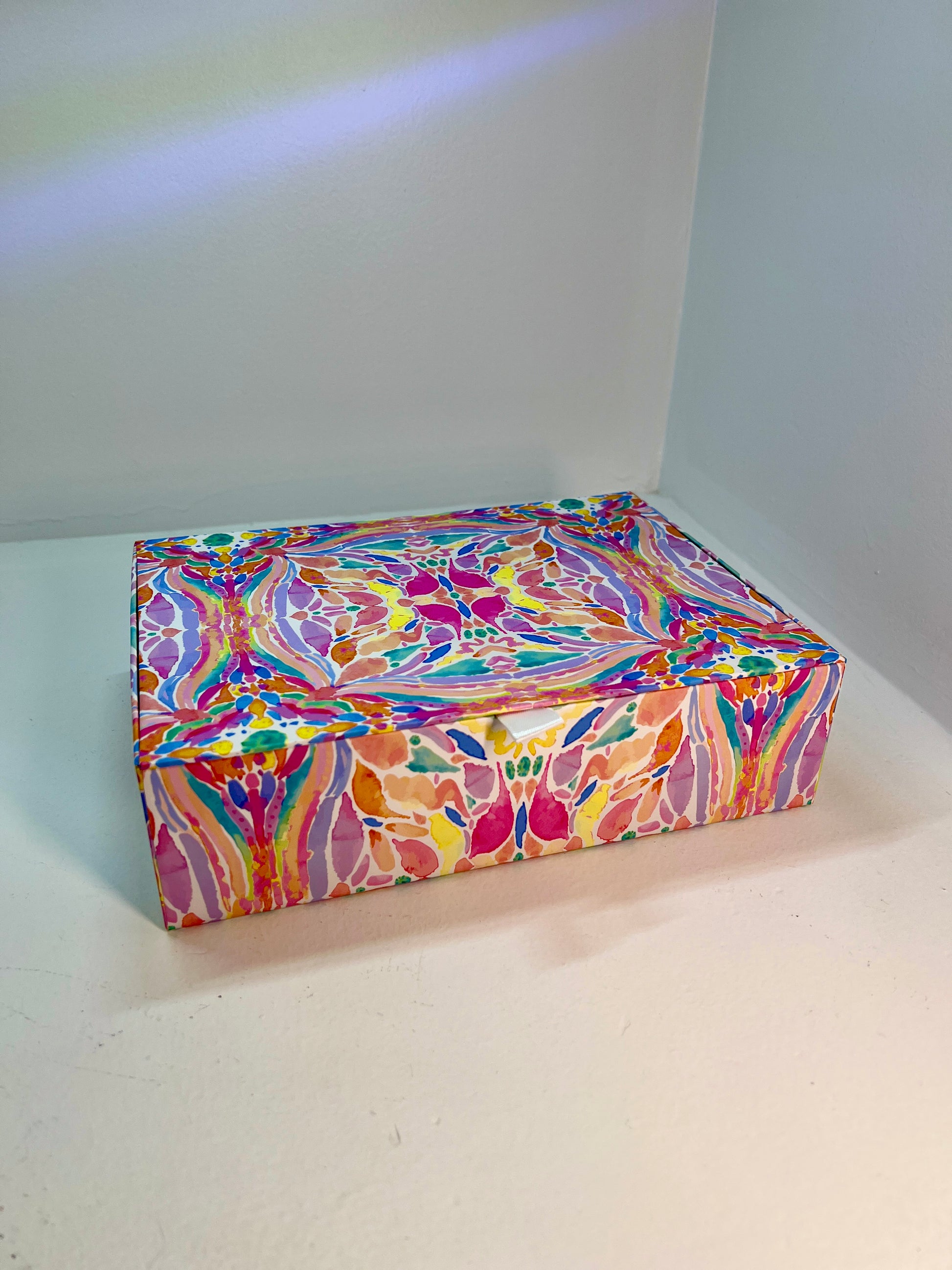 Packaged in a vibrant keepsake box with a multicolor kaleidoscope pattern and a glossy turquoise lid. Colorful on the outside, comforting on the inside.
