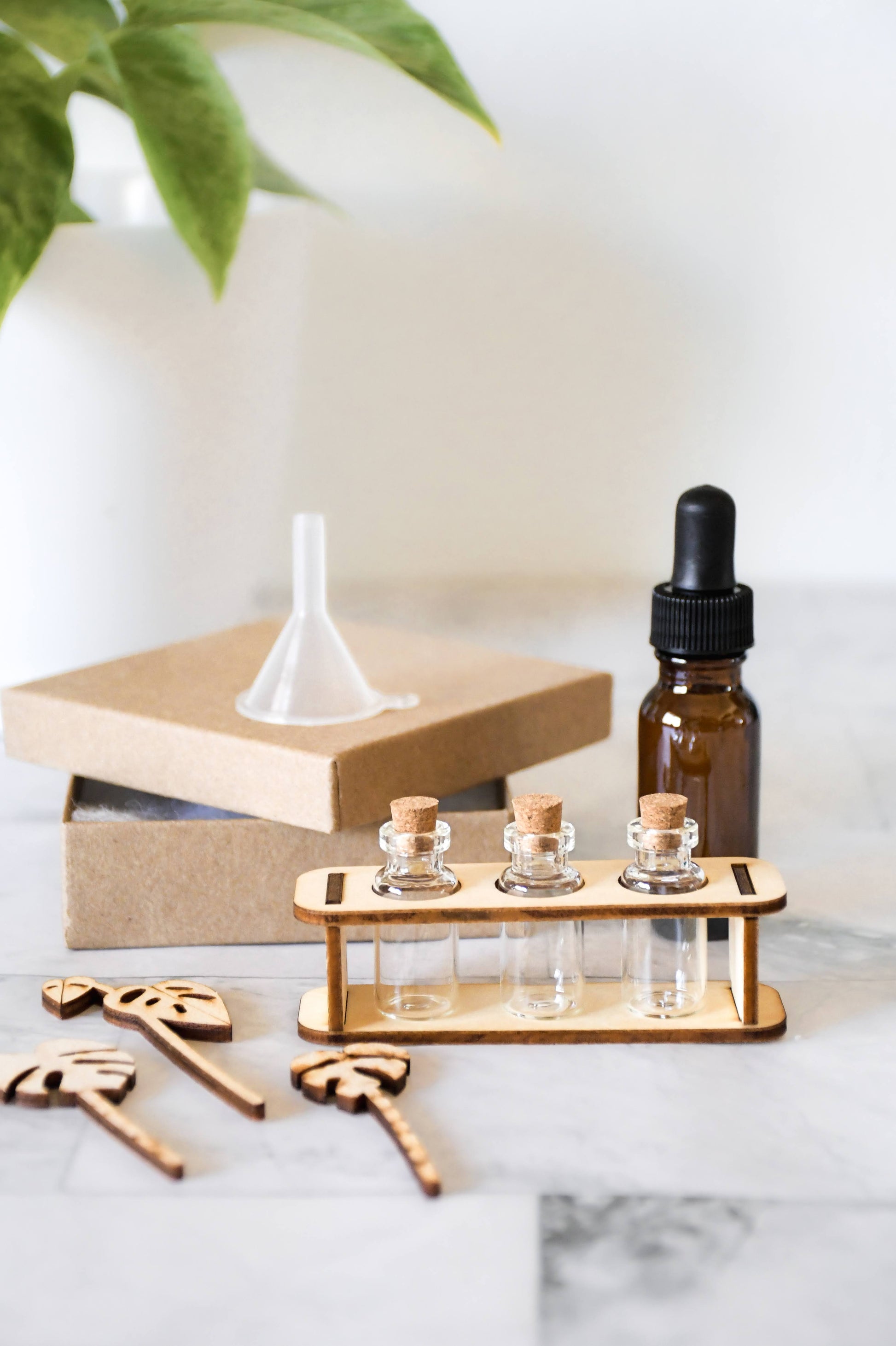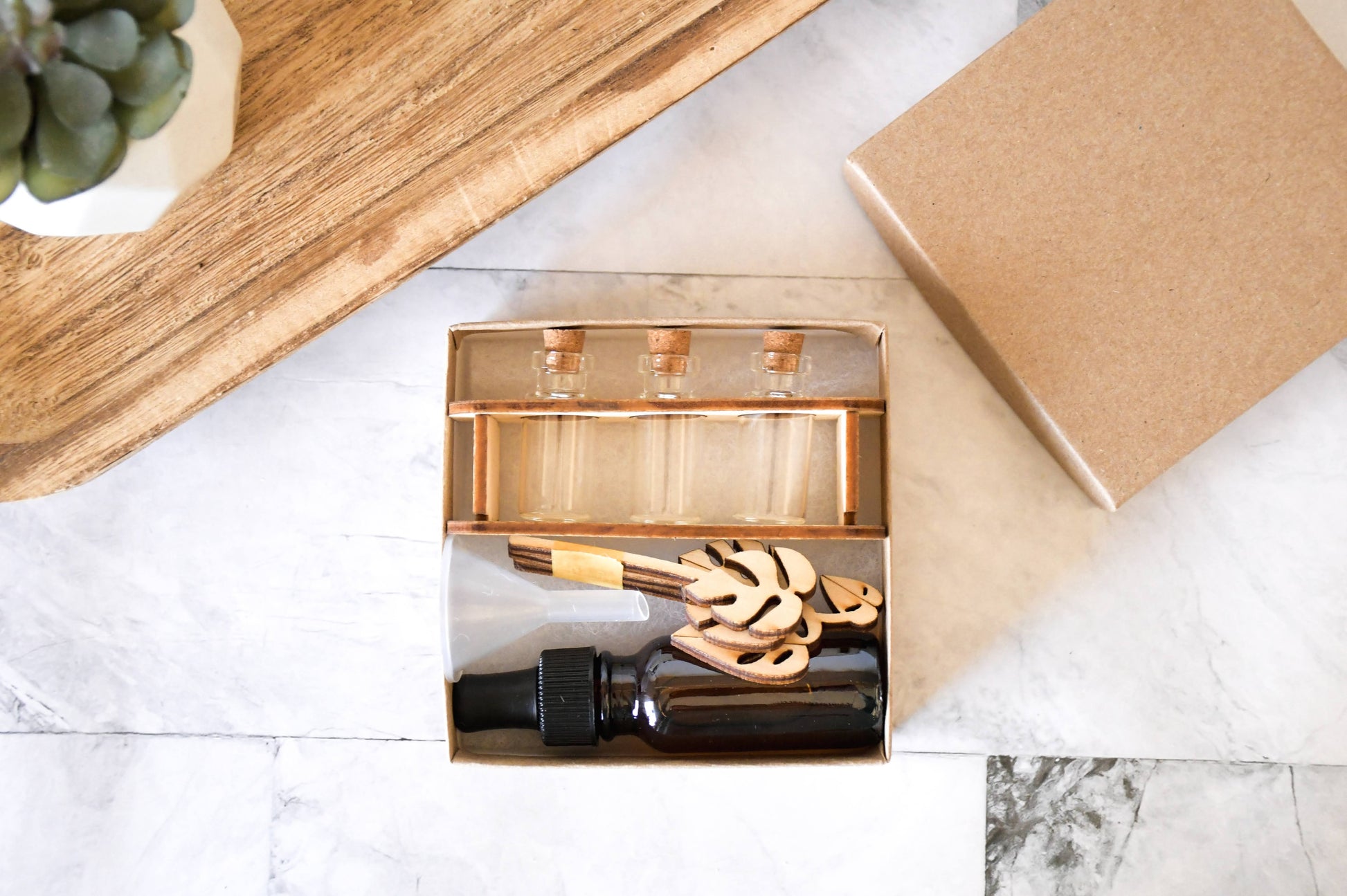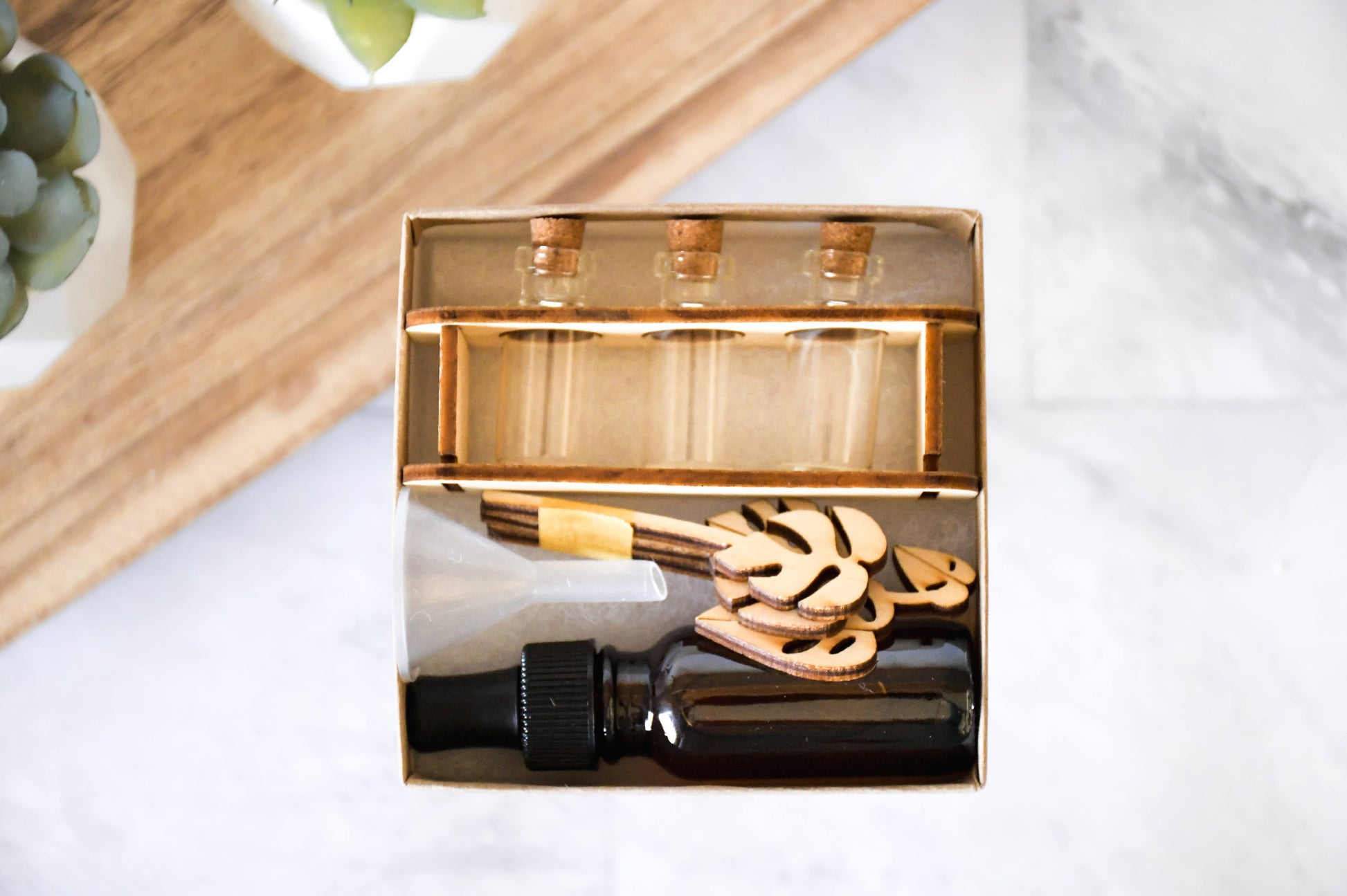 This adorable tiny fragrance diffuser is perfect for plant lovers. The wooden Monstera leaves propagate fresh fragrances and a fun atmosphere. The set up includes a wooden stand, 3 glass diffuser bottles, three wooden monstera leaves, a dropper bottle full of the fragrance blend you chose (additional descriptions available for each in my scent glossary!) and a small funnel to use when adding the oil to your diffuser vials.
