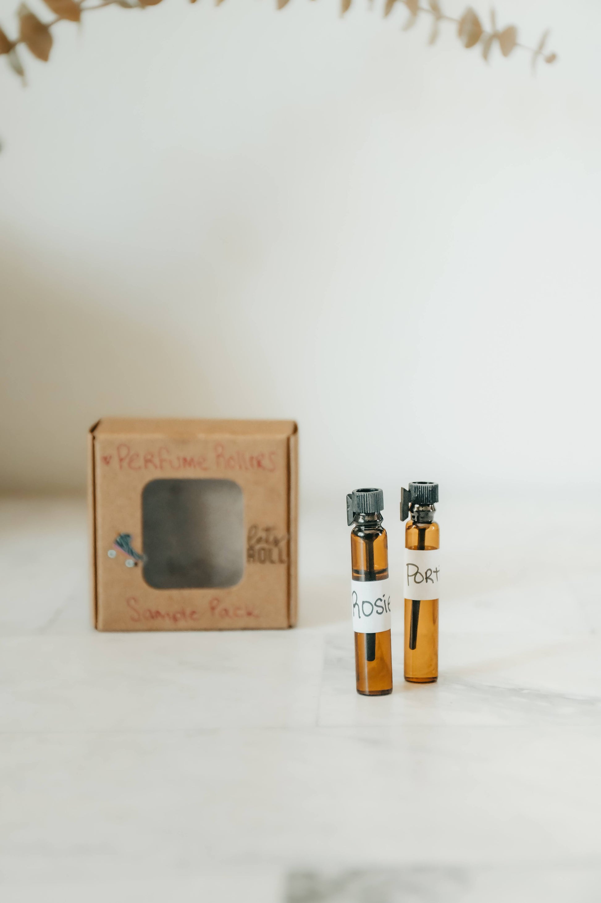 These mini amber glass vials (approx. 1 ml each) come hand-labeled, securely capped, and nestled into a kraft “Let’s Roll” sampler box. Choose as many (or as few!) as you'd like—each sample is just $2.